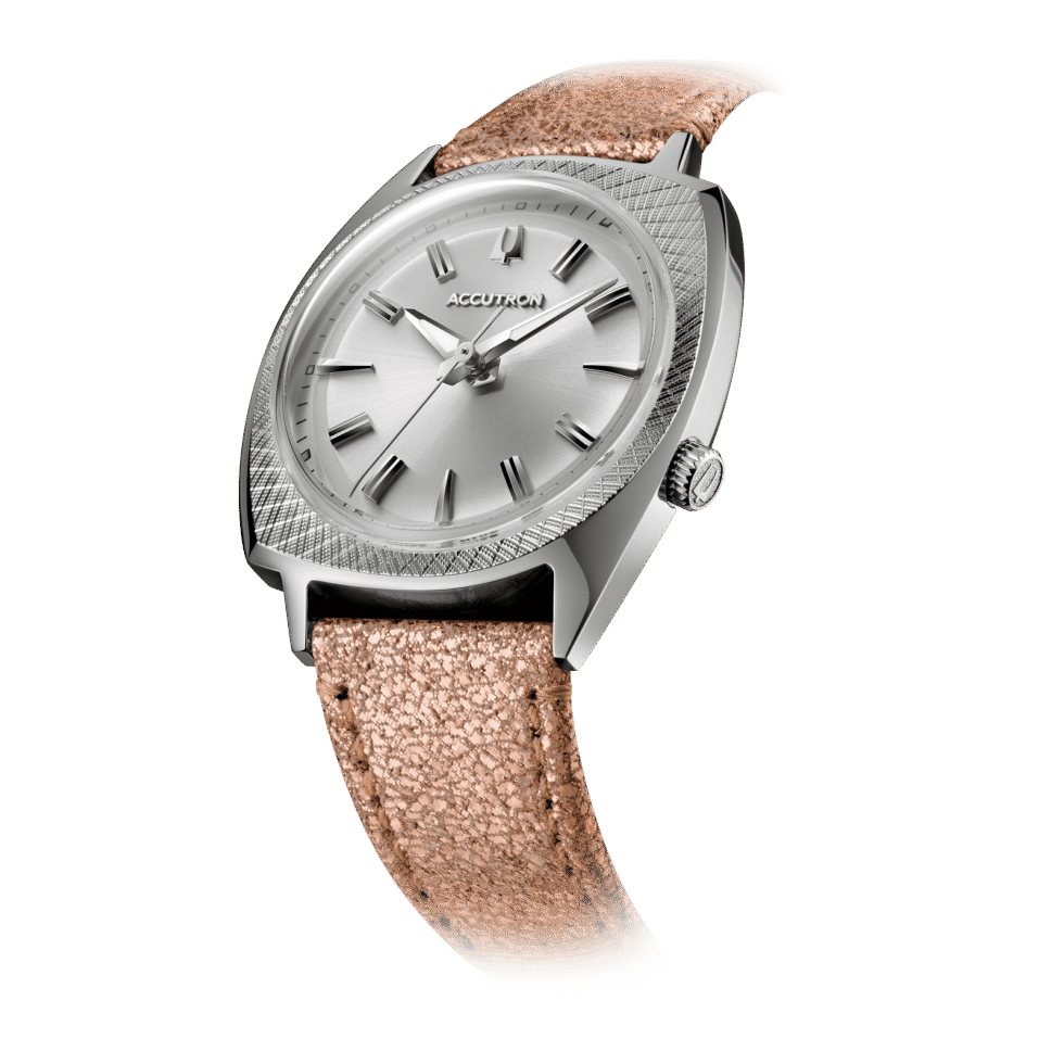 The “565,” also known as the “Football Cross Hatch” watch made a statement when it was first released in 1966 because of its distinct Archimedean and Time Series spirals incorporated into the asymmetrical case design as seen in the crosshatch detail on the current bezel. Used by many period architects and interior designers, this is a prime example of Accutron’s connection to the unique American aesthetic. Drawing inspiration from the beautifully designed Le Kool champagne bottles with luxurious accents of metallic hues, this Accutron Legacy “565” features a 34mm stainless steel case with crown placement at 4 o’clock, a 3-hand silver white dial, bold hour markers and an outer minutes track, set on a blush metallic leather strap with two additional black and gold metallic leather straps.