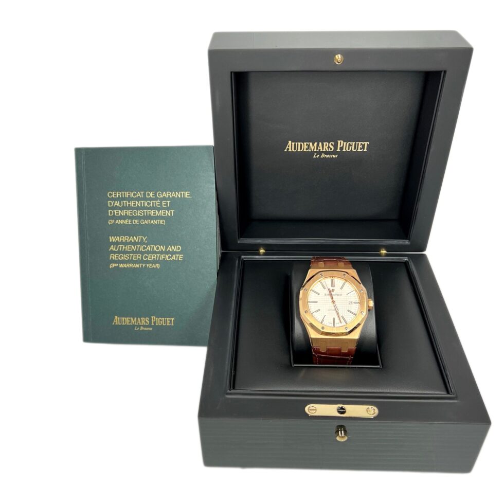 Preowned-15400OR.OO.D088CR.01 Audemars Piguet. This is a high-end men’s watch that features an 18K rose gold case with a diameter of 41mm and a fixed 18K rose gold bezel. The silver-toned dial has rose gold hands and index hour markers and is luminescent. It displays the date at the 3 o’clock position and has a self-winding movement with 60 hours of power reserve. The watch is protected by scratch-resistant sapphire crystal and has a transparent case back. It comes with a brown alligator leather strap and a deployant buckle and has a water resistance of 50 meters / 165 feet.