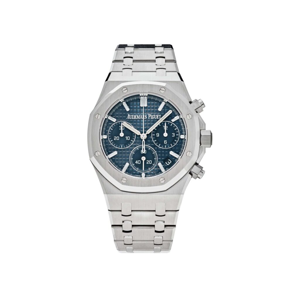 This Royal Oak Selfwinding Chronograph is crafted in a 41 stainless steel case and styled on a steel bracelet. Unique to the brand is the Blue Bleu Suit, Nuage 50 colored dial with the ‘Grand Tapisserie’ pattern. The dial hosts white gold applied stick hour-markers and Royal Oak hands with luminescent coating.Â