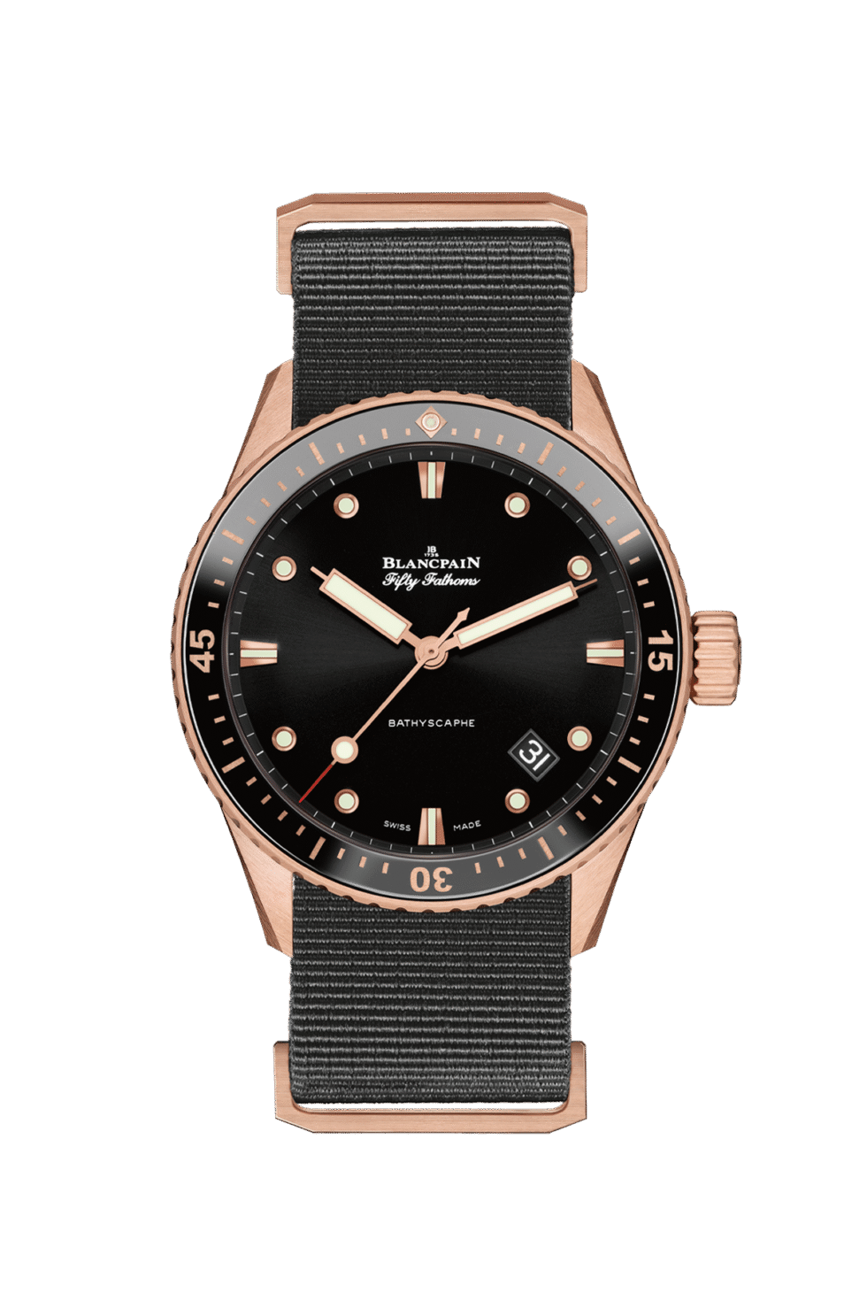 Blancpain Fifty Fathoms Bathyscaphe 5000 36S30 NABA The Blancpain Fifty Fathoms Bathyscaphe 5000 36S30 NABA is a luxurious men’s watch that features a 43mm case made of Sedna® gold, a proprietary alloy of gold, copper, and palladium that gives it a unique rose-gold color and excellent durability. The watch also has a NATO strap with a folding clasp that adds to its sporty and sophisticated design. Powered by the 1315 caliber movement, this watch provides high accuracy and reliability. It has a power reserve of 120 hours, which means it can run for five days without winding. The watch also features a unidirectional rotating bezel, which is essential for divers to measure their elapsed time underwater. The Blancpain Fifty Fathoms Bathyscaphe 5000 36S30 NABA is water-resistant up to 30 bar, which means it can withstand water pressure up to a depth of 300 meters or 1000 feet. This makes it suitable for diving and other water activities. The watch also has luminous hour markers and hands, making it easy to read in low-light conditions. The NATO strap is comfortable and durable, making it ideal for everyday wear. The folding clasp provides a secure fit on the wrist and makes it easy to take on and off. The strap also has a unique texture that adds to the watch’s overall style and elegance. Overall, the Blancpain Fifty Fathoms Bathyscaphe 5000 36S30 NABA is a high-end watch that combines advanced features with luxurious design. The Sedna® gold case and NATO strap with a folding clasp add to its elegance, while the 1315 caliber movement provides excellent accuracy and reliability. It is a great choice for anyone who values quality craftsmanship and sophisticated style.