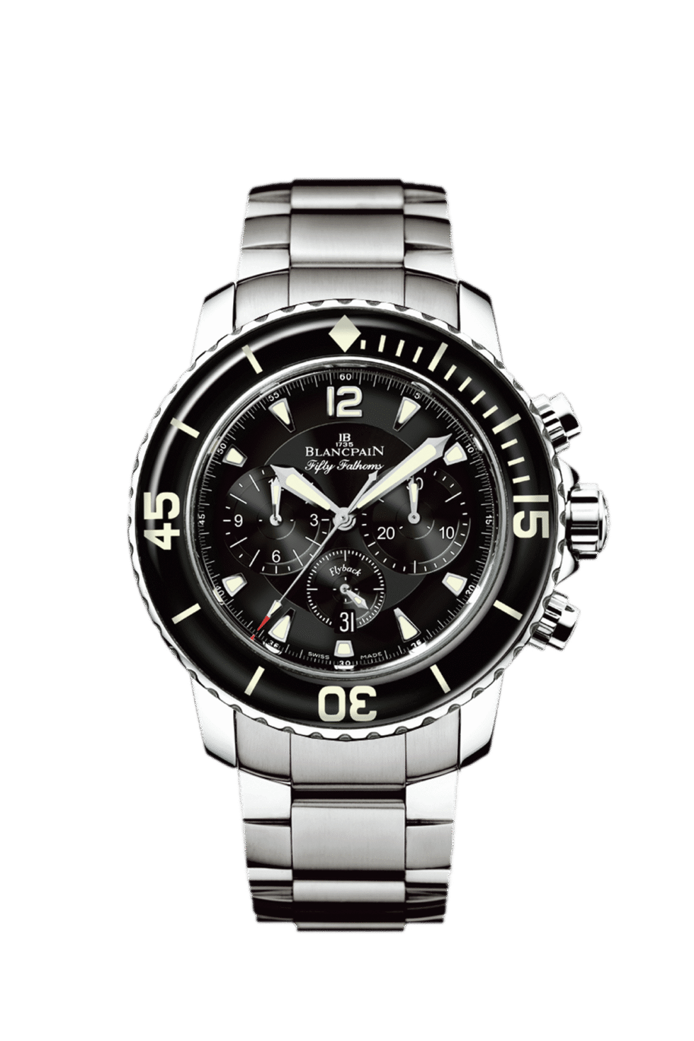 Blancpain Fifty Fathoms Chronographe Flyback 5085F 1130 71S The Blancpain Fifty Fathoms Chronographe Flyback 5085F 1130 71S Men’s watch is a high-end timepiece from the Fifty Fathoms collection. It features a 45 mm Steel case, which is both durable and stylish, and is powered by the F185 caliber automatic movement, known for its accuracy and reliability. One of the standout features of this watch is the chronograph function, which allows you to measure elapsed time with precision. The flyback feature allows you to quickly reset the chronograph and start a new timing session without having to stop and reset the stopwatch. The black dial is accented with luminous hour markers and hands, making it easy to read in low-light conditions. The unidirectional rotating bezel is also in steel with a black insert and orange markings, providing an additional function for divers to track elapsed time underwater. The watch also has a sapphire crystal case back, allowing you to see the movement in action. The Steel bracelet adds to the watch’s durability and gives it a high-end feel, and it has a folding clasp for a secure and comfortable fit. In terms of design, the Blancpain Fifty Fathoms Chronographe Flyback 5085F 1130 71S Men’s watch has a sleek and sporty look, with a black dial and orange accents. The Steel case and bracelet add to the watch’s durability and give it a high-end feel. The water resistance of this watch is up to 30 bar, making it suitable for diving and other water-related activities. Overall, the Blancpain Fifty Fathoms Chronographe Flyback 5085F 1130 71S Men’s watch is a sophisticated timepiece that combines style and functionality, making it an ideal choice for those who need a reliable and stylish watch for everyday use or underwater activities.