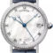 9068BB/52/976/DD00 Breguet This watch has a 33.5 mm 18k White Gold case. The 18K white gold fixed bezel and lugs are set with 88 diamonds weighing approximately 0.606ct.. The mother-of-pearl dial. Black Roman numerals. Blue-colored hour hands. Central second hand. The date window is located at the 3 o’clock position. The watch performs the following functions: hours, minutes, seconds, date. Self-winding movement is powered by a ?alibre 591A. The power reserve is approximately 38 hours. 25 Jewels. Case Thickness – 7.55 mm. The case back is transparent. Sapphire crystal protects the front and backside of the watch. Dark blue alligator leather strap with white gold buckle. This model is water-resistant up to 30 m.