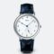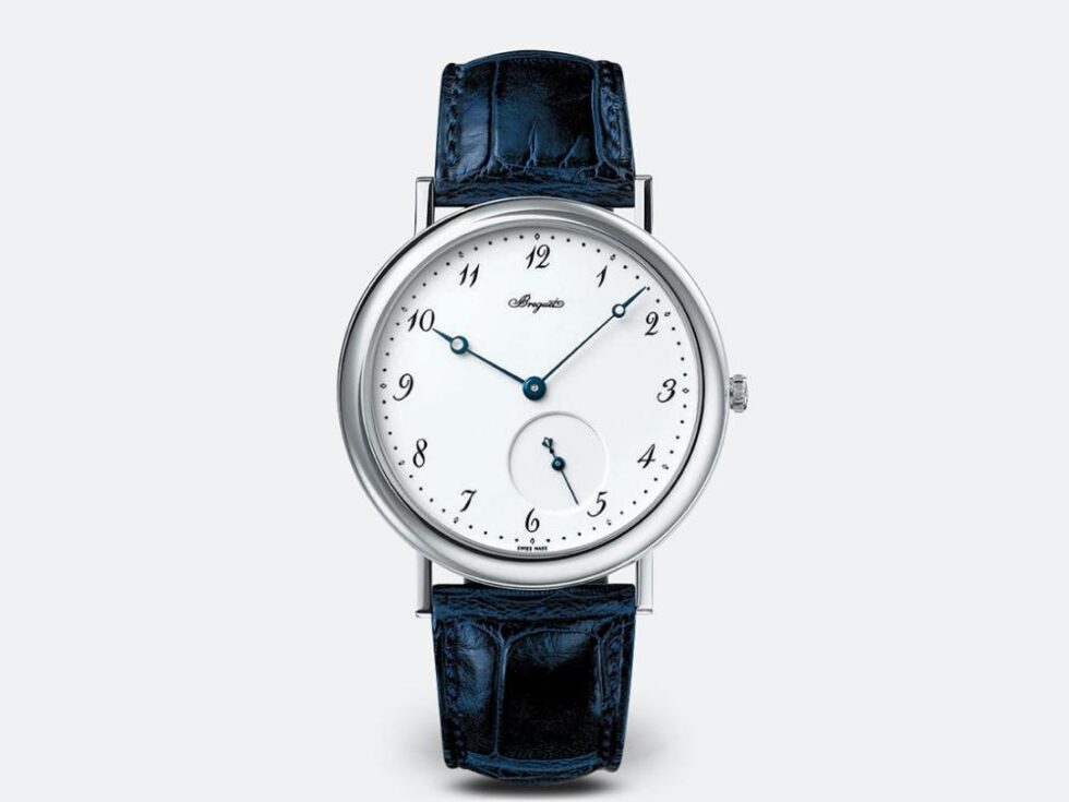 Classique wristwatch in 18-carat white gold. Self-winding movement with seconds subdial. Balance spring and lever in silicon. White ‘grand feu’ enamel dial with Breguet Arabic numerals and Secret signature. Water-resistant to 3 bar ( 30 m ). Diameter : 40 mm. Also in yellow gold. Available with silvered gold dial, hand-engraved on a rose engine.