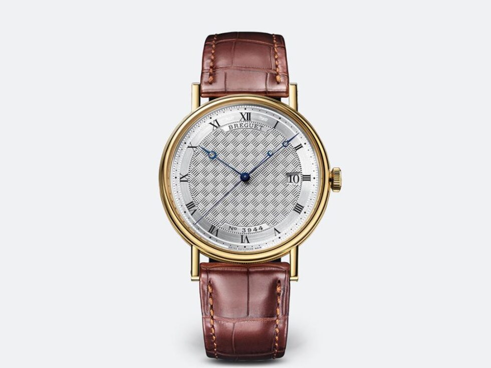 Classique wristwatch in 18-carat yellow gold. Self-winding movement with date. Balance spring, lever and escape wheel in silicon. Silvered gold dial hand-engraved on a rose engine. Sapphire case back. Water-resistant to 3 bar ( 30 m ). Diameter : 38 mm. Also in rose or white gold. Available with gold bracelet. Also with white ‘grand feu’ enamel dial, Breguet Arabic numerals and Secret signature.