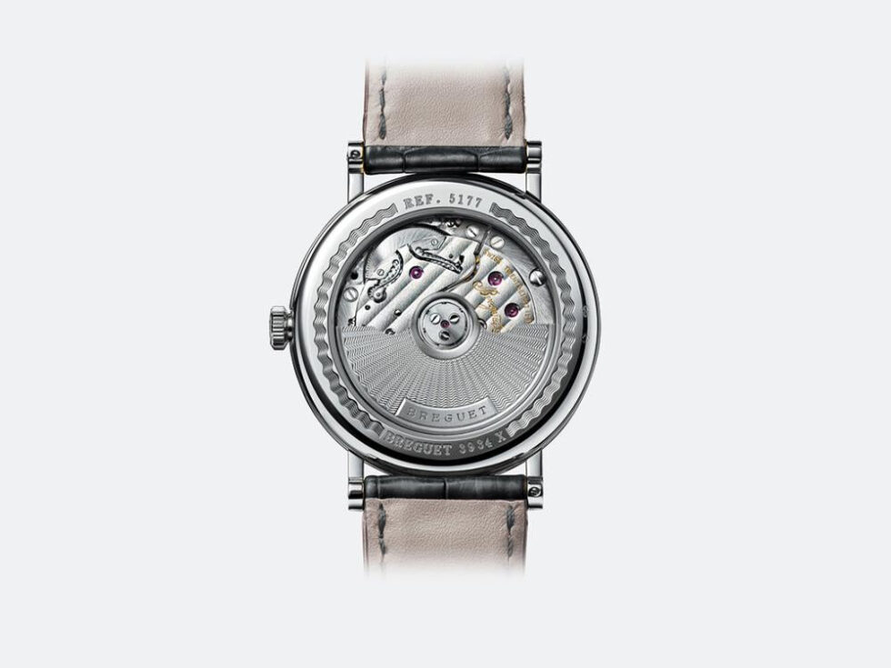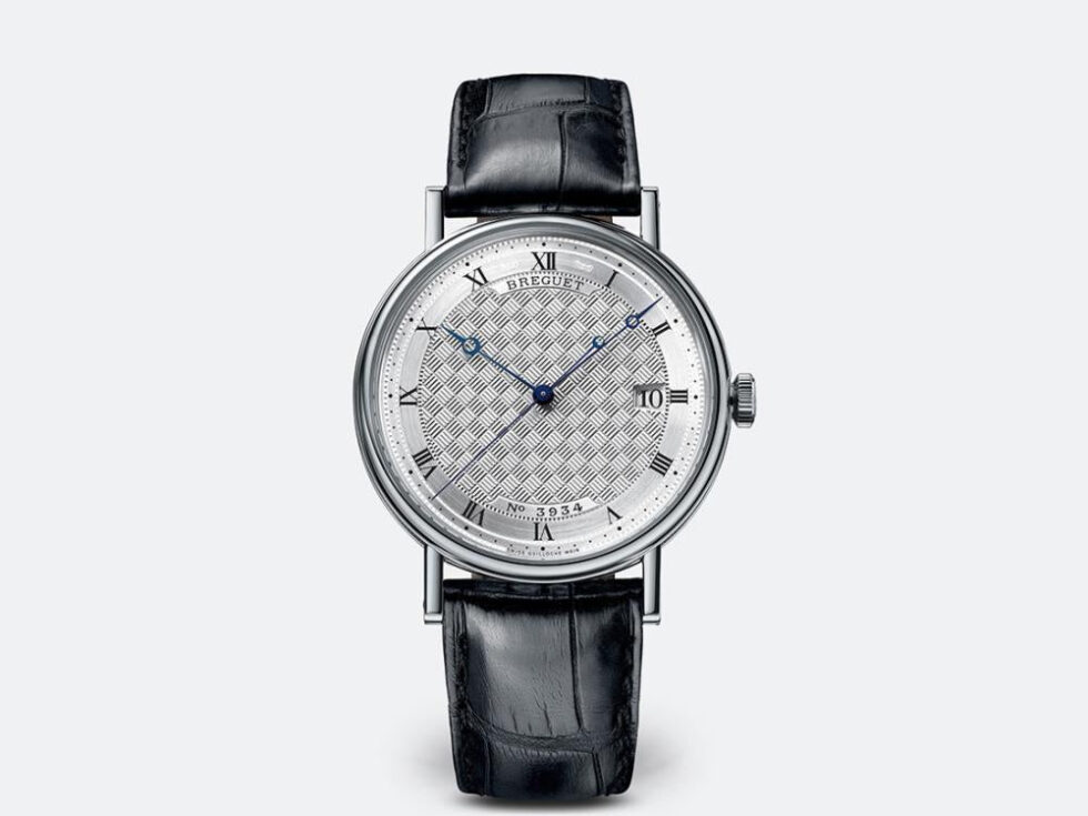 Classique wristwatch in 18-carat white gold. Self-winding movement with date. Balance spring, lever and escape wheel in silicon. Silvered gold dial hand-engraved on a rose engine. Sapphire case back. Water-resistant to 3 bar ( 30 m ). Diameter : 38 mm. Also in yellow or rose gold. Available with gold bracelet. Available with white ‘grand feu’ enamel dial, Breguet Arabic numerals and Secret signature.