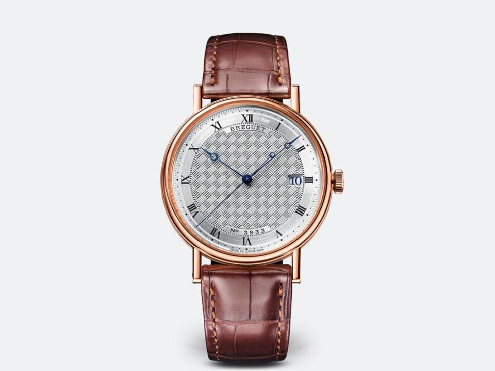 Classique wristwatch in 18-carat rose gold. Self-winding movement with date. Balance spring, lever and escape wheel in silicon. Silvered gold dial hand-engraved on a rose engine. Sapphire case back. Water-resistant to 3 bar ( 30 m ). Diameter : 38 mm. Also in yellow or white gold. Available with gold bracelet. Available with white ‘grand feu’ enamel dial, Breguet Arabic numerals and Secret signature.