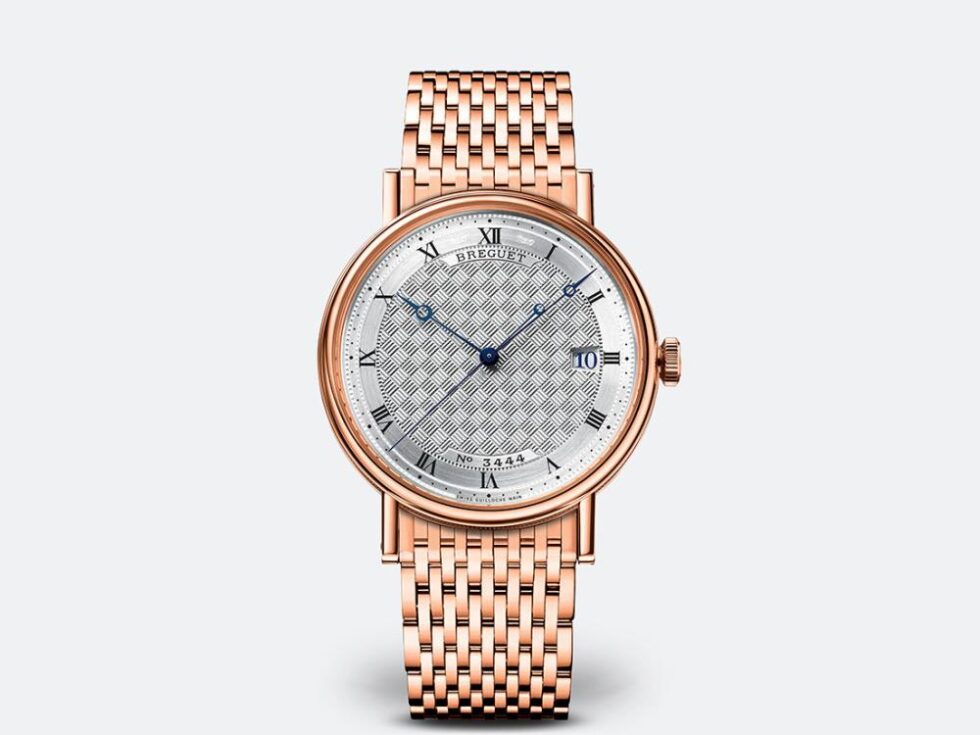 Classique wristwatch in 18-carat rose gold. Self-winding movement with date. Balance spring, lever and escape wheel in silicon. Silvered gold dial hand-engraved on a rose engine. Sapphire case back. Water-resistant to 3 bar ( 30 m ). Diameter : 38 mm. Also in yellow or white gold. Available with white ‘grand feu’ enamel dial, Breguet Arabic numerals and Secret signature.