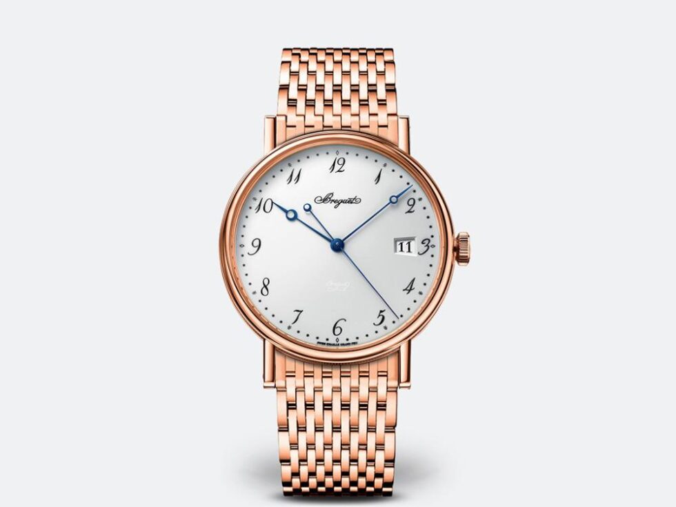 Classique wristwatch in 18-carat rose gold. Self-winding movement with date. Balance spring, lever and escape wheel in silicon. White ‘grand feu’ enamel dial with Breguet Arabic numerals and Secret signature. Sapphire case back. Water-resistant to 3 bar ( 30 m ). Diameter : 38 mm. Also in white or yellow gold. Available with silvered gold dial.