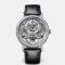 Case in platinum with a finely fluted case band. Sapphire case back. 41 mm diameter. Welded lugs with screw bars. Water-resistant to 3 bar (30m). Skeleton dial in silvered 18-carat gold. Individually numbered and signed BREGUET. Hours chapter with Roman numerals on a sapphire disc. Breguet open-tipped hands in blued steel. Retrograde dates indication at 12 o’clock, days at 9 o’clock, and months and leap years at 3 o’clock. Small seconds on the tourbillon axis. Manually wound movement with tourbillon and perpetual calendar. Numbered and signed BREGUET. Cal. 558QP3. 14 1/2 lines, 21 jewels. Power reserve of 50 hours. Lateral lever escapement and balance with adjustment screws on a Breguet’spring. Frequency 2,5Hz. Adjusted in six positions. Leather strap with a triple-blade folding clasp. Also in rose gold.