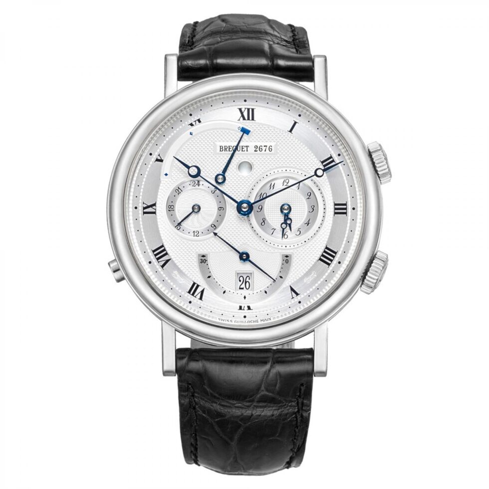 5707BB/12/9V6 Breguet. This Watch has a 39.00 mm 18K white gold case. Fixed 18K white gold bezel. The blued steel Breguet hands are clearly visible on the silver-plated and hand-guillochĂ© design, and the Roman numerals and minute divisions on the satin-finish outer circle are embossed with a stamp. Alarm dial – 3 o’clock position, date and small second hand – 6 o’clock position, second time zone on 24-hour dial – 9 o’clock position, power reserve indicator – 11.30 position, alarm indicator – 12 o’clock position. Crown (2 o’clock position) – for winding and setting the time, 4 o’clock position – for setting and winding the alarm, in the 8 o’clock position – for turning the alarm on/off; caseback with sapphire window on 6 screws. The watch performs following functions: hours, minutes, seconds, date, second time, alarm clock, alarm on/off indicator, alarm factory indicator. Self-winding mechanical movement is powered by a ?alibre Breguet 519F. Power reserve approximately 45 hours. Case Thickness – 11.25 mm. Case back is transparent. Sapphire crystal protects front and back side of the watch. Alligator leather strap with 18k white gold buckle. Water resistance up to 30m.