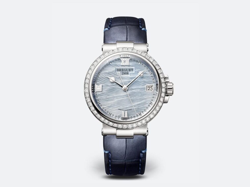 Marine Dame wristwatch in 18-carat white gold. Self-winding movement with date. Balance spring, lever and escape wheel in silicon. Bezel set with 50 diamonds, approx. 1.165ct, natural mother-of-pearl dial, hand-engraved on a rose engine with ”marea” motif, Oscillating weight decorated with mother-of-pearl, hand-engraved on a rose engine with ”marea” motif, set with 31 diamonds. Sapphire caseback. Water-resistant to 5 bar (50m). Diameter: 33.8mm. Also available in rose gold. Available with leather or rubber strap.