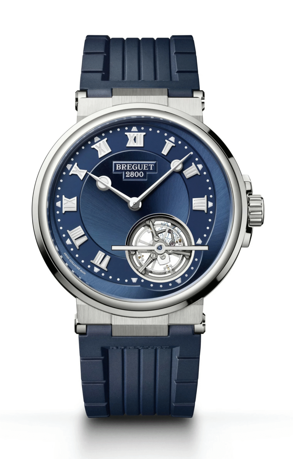 5577PT/Y2/5WV  Breguet  This watch comes with 42.5 mm Platinum case. Fixed Platinum bezel. Screw-locked crown. Blue sunburst dial. Off-centred chapter ring with hands and hour-markers. Silvery Roman numerals with luminescent coating. Silvery hour hands with luminescent coating. Tourbillon located at the 5 o’clock position. Small seconds on the tourbillon shaft. The watch performs following functions: hours, minutes, small seconds ,tourbillon. Self-winding movement is powered by a ?alibre 581. 33 Jewels. Power reserve approximately 80 hours. Case Thickness – 9.35 mm. Case back is transparent. Sapphire crystal protects front and back side of the watch.Blue rubber strap. This model is water-resistant up to 100 m.