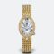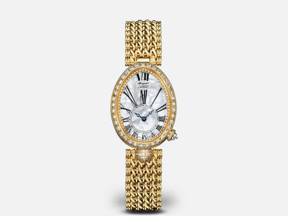 Reine de Naples wristwatch in 18-carat yellow gold. Bezel dial, flange and lug set with 139 diamonds totaling approx. 1.32 cts. Self-winding movement. Balance spring in silicon. White natural mother-of-pearl dial. Off-centred chapter ring with Roman numerals. Sapphire case back. Water-resistant to 3 bar ( 30 m ). Dimensions : 33 x 24.95 mm. Also in white gold and rose gold. Available with satin bracelet.