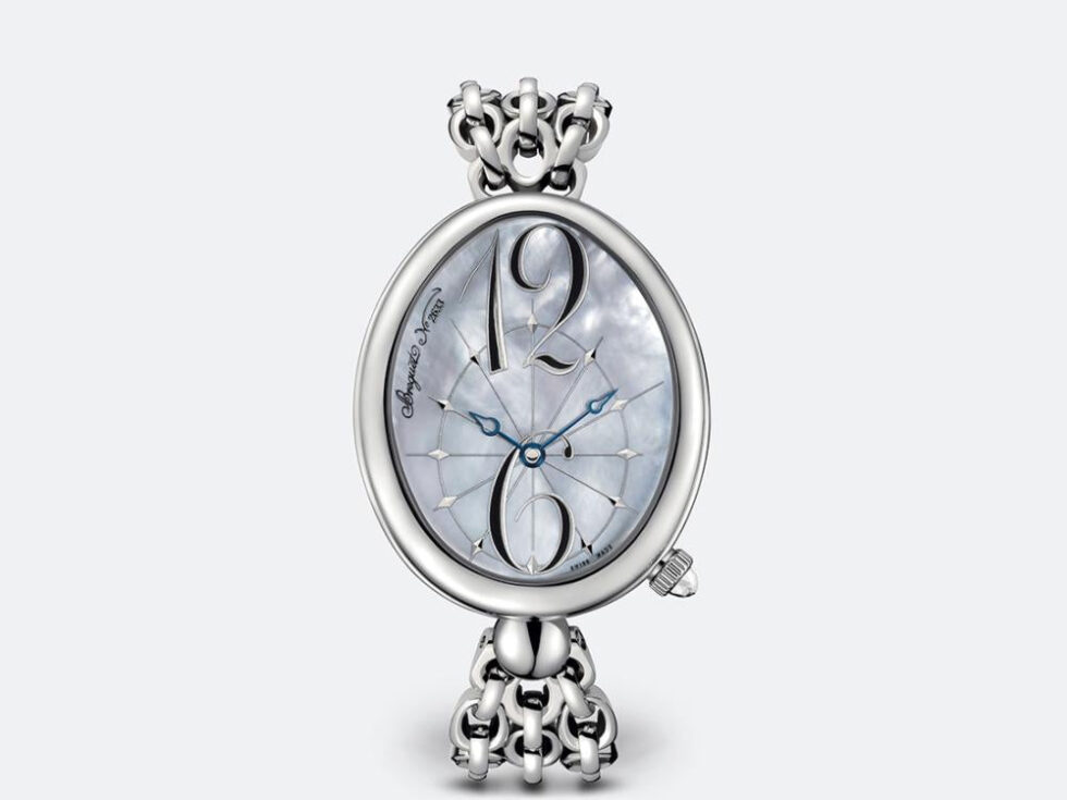 Reine de Naples wristwatch in steel. Self-winding movement. Balance spring and escapement in silicon. White natural mother-of-pearl dial with Breguet Arabic numerals. Sapphire caseback. Water-resistant to 3 bar ( 30 m ). Dimensions : 43.75 x 35.50 mm. Also with blue natural mother-of-pearl dial.