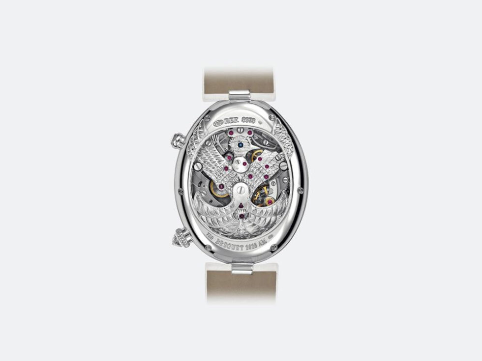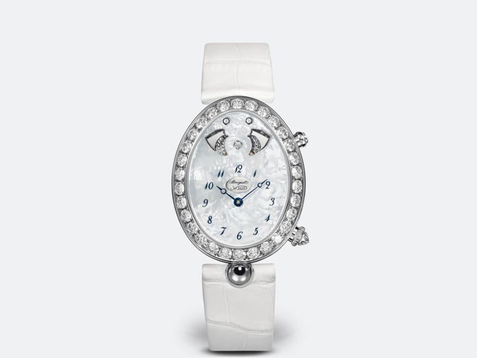 Reine de Naples ‘Grande Complication’ wristwatch in 18-carat white gold with hour strike. Bezel set with 30 diamonds weighing approx. 2.93 cts. Alarm on/off indicator set with one diamond. Self-winding movement engraved by hand. Balance spring and lever in silicon. White natural mother-of-pearl dial. Off-centred chapter ring with Breguet Arabic numerals. Sapphire case back. Water-resistant to 3 bar ( 30 m ). Dimensions : 38.45 x 30.40 mm.