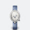 Case in steel, cambered ovoid with a delicately fluted case band. Sapphire-crystal case back. Dimensions 32.7 x 27.3mm. Water resistant to 3 bar (30m). Dial in grained natural white mother-of-pearl. Off-centre chapter ring at 6 o’clock with Roman numerals in white natural mother-of-pearl marquetry. Self-winding movement. Cal. 586/1. 38 hours power reserve. In-line Swiss lever escapement. Breguet balance on a silicon spring. Balance frequency 3Hz.