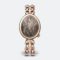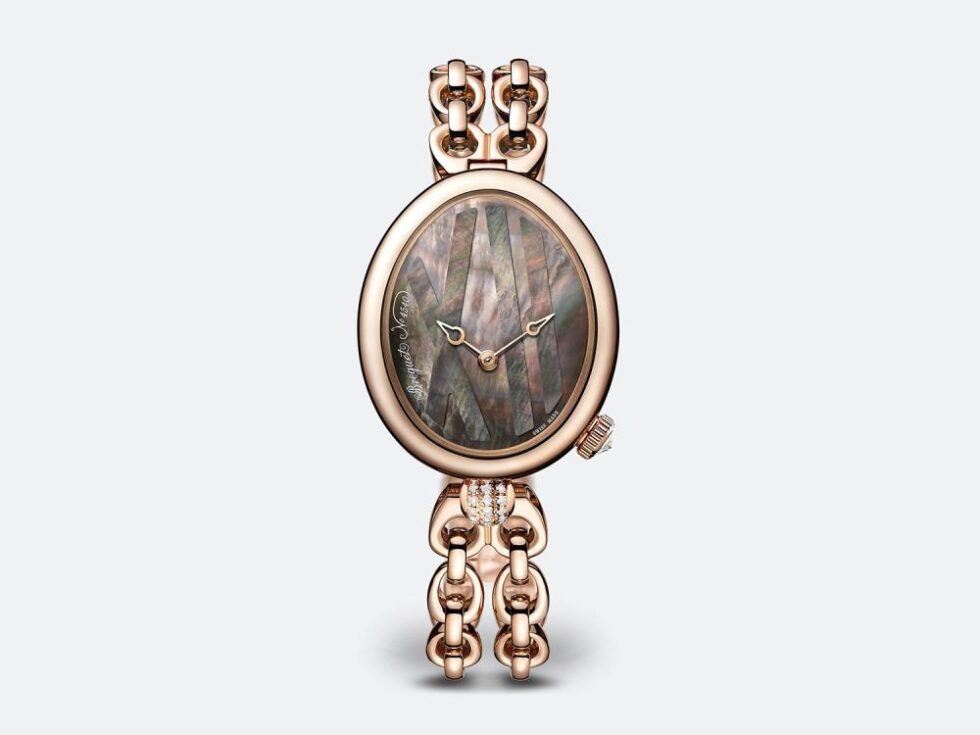 Case in 18-carat rose gold, cambered ovoid with a delicately fluted case band. Crown set with a briolette diamond (approx. 0.15 ct). Attachment set with 16 brilliant-cut diamonds (approx. 0.08 ct). Sapphire-crystal case back. Dimensions 32.7 x 27.3mm. Water resistant to 3 bar (30m). Dial in Tahitian mother-of-pearl. Off-centre chapter ring at 6 o’clock with Roman numerals in Tahitian mother-of-pearl marquetry. Self-winding movement.