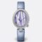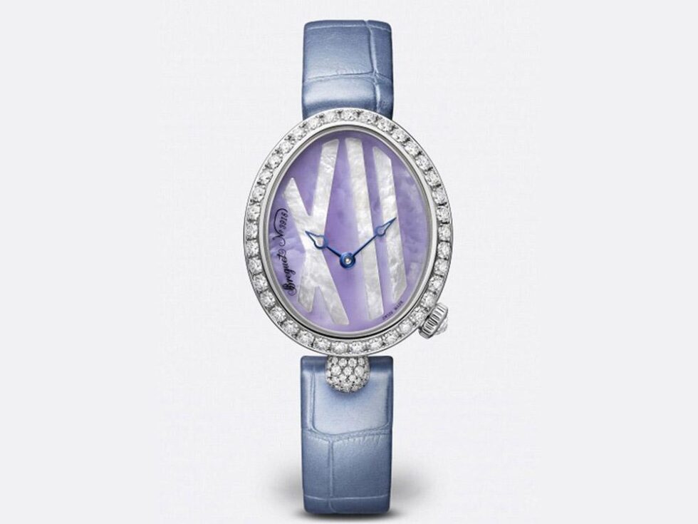 Reine de Naples wristwatch in 18-carat white gold with a delicately fluted caseband. Bezel and lug set with 64 brilliant-cut diamonds (approx. 1.654 cts). Crown set with a briolette diamond (approx. 0.15 ct). Dial in lavender-coloured mother-of-pearl, individually numbered and signed Breguet. Offset hours chapter at 6 o’clock with Roman numerals in white natural mother-of-pearl marquetry. Breguet open-tipped hands in blued steel. Self-winding movement, numbered and signed Breguet. Cal. 586/1. 6 1/2 lignes, 29 jewels. 38 hours power reserve. In-line Swiss lever escapement. Breguet balance on a silicon spring. Balance frequency 3Hz. Adjusted in 6 positions. Sapphire-crystal caseback. Water-resistant to 3 bar (30m). Dimensions: 32.7 x 27.3mm. Leather strap. Also available with a white gold bracelet set with diamonds.