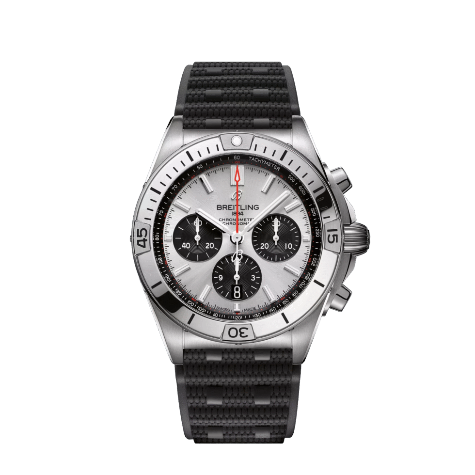 AB0134101G1S2 Breitling This watch has a 42 mm Stainless steel case. Unidirectional Stainless steel bezel with ratcheted. Silvery dial with three black cub-dials. Silvery applied hour markers. Silver hour hands with luminescent coating. Minute markers around the outer rim. Central second hand. The date window is located at the 6 o’clock position. This watch has three sub-dials chronograph : 60 seconds sub-dial at 9 o’clock, 30-minute sub-dial at 3 o’clock, 12-hour counter at 6 o’clock. The watch performs following functions: hours, minutes, seconds, date, chronograph. Self-winding mechanical movement is powered by a ?alibre 01 (Manufacture). 47 jewels. Power reserve approximately 70 hours. Case Thickness – 15.1 mm. Case back is transparent. Sapphire crystal protects front and back side of the watch. Black rubber strap with folding clasp buckle. This model is water-resistant up to 200 m.