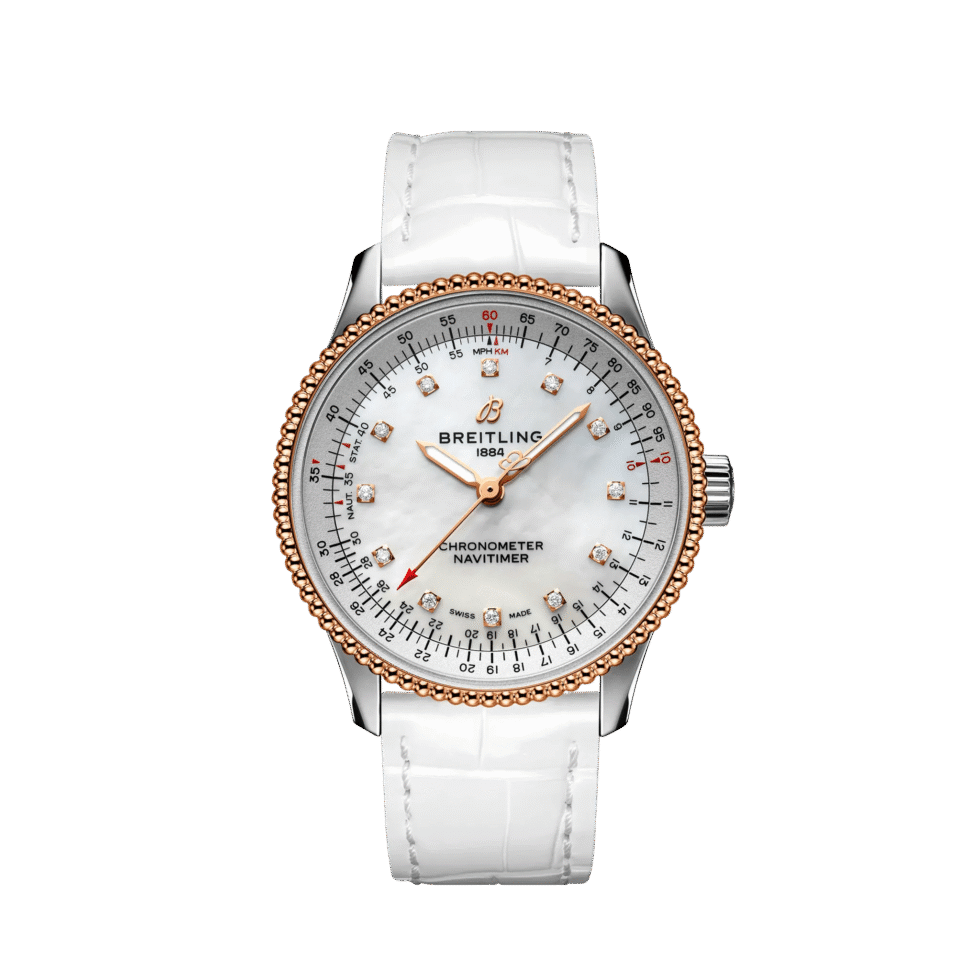 U17395211A1P3 Breitling The Breitling Navitimer Automatic U17395211A1P3 is a stunning timepiece that is sure to impress watch enthusiasts. This watch features a 35mm stainless steel and 18k red gold case, along with a bidirectional slide rule stainless steel and 18k red gold bezel that gives it a classic yet versatile look. The mother-of-pearl dial is adorned with gold-toned luminescent counters and diamond index hour markers, making this watch both elegant and practical. The self-winding Calibre “Breitling 17” movement powers this watch, providing accurate and reliable timekeeping with a power reserve of approximately 38 hours. The water resistance level of up to 3 bars means that this watch is suitable for daily wear. To complete the exceptional look of this watch, it comes with a white leather strap with a tang stainless steel buckle that adds a touch of sophistication. Overall, the Breitling Navitimer Automatic U17395211A1P3 is a true masterpiece that is sure to turn heads. It offers a perfect combination of style and functionality and is ideal for those who appreciate the finer things in life.