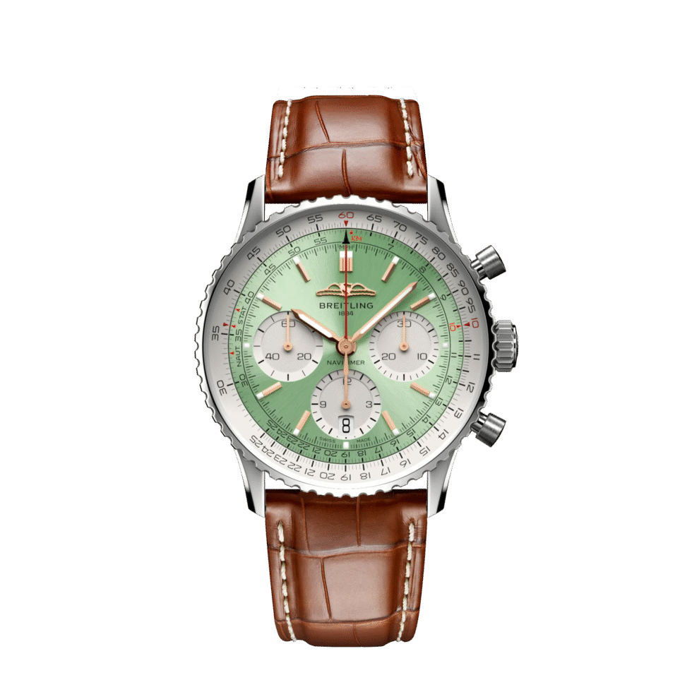 AB0139211L1P1 Breitling The Breitling Navitimer AB0139211L1P1 Men’s Watch is a stylish and sophisticated timepiece from Breitling. The 41mm stainless steel case with bidirectional stainless steel bezel with a slide rule gives the watch a sleek and modern look. The green dial features silver colored sub-dials, gold-toned luminescent index and hour markers, and gold-colored luminous hour hands, which can be read easily both day and night. The chronograph function features three sub-dials: a 60-second sub-dial at 9 o’clock, a 30-minute sub-dial at 3 o’clock, and 12-hour counters at the 6 o’clock marker, providing an accurate measurement of elapsed time. The date window is located at the 6 o’clock position, keeping track of important dates easier. The self-winding mechanical movement is powered by a Calibre Breitling 01 (Manufacture) with 47 jewels and 28,800 v.p.h. provides precise and reliable timekeeping. The case is 13.6mm thick, and the front and back sides of the watch are protected by sapphire crystal, while the case back is transparent, allowing a view of the mechanism inside. The watch features functions of hours, minutes, seconds, date, and chronograph. The Breitling logo is located under the 12 o’clock marker. The gold brown alligator leather strap comes with a stainless steel folding buckle. The model is water-resistant up to 30m, making it suitable for everyday use.