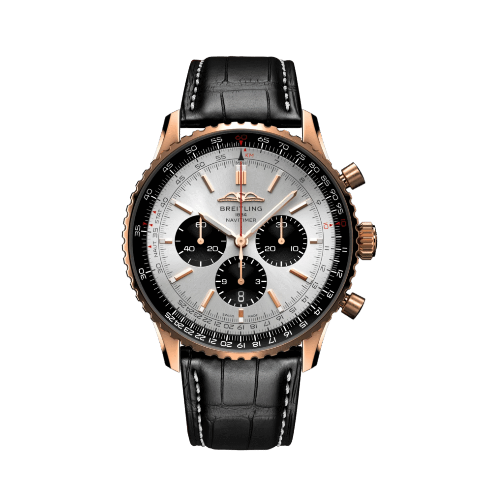 RB0137241G1P1 Breitling The Breitling Navitimer RB0137241G1P1 is a Men’s Watch with a 46 mm 18K Red Gold case and a bidirectional 18K Red Gold bezel with a slide rule. The crown is non screw-locked (with two gaskets), and the silver dial contains black colored sub-dials, gold-toned luminescent index and hour markers, and gold colored luminous hour hands. This watch has three sub-dials for the chronograph function, with a 60-second sub-dial positioned at 9 o’clock, a 30-minute sub-dial placed at 3 o’clock, and 12-hour counters located at 6 o’clock. The date window is situated at the 6 o’clock position, and the self-winding mechanical movement is powered by a Calibre Breitling 01 (Manufacture) with 47 jewels and 28,800 v.p.h., offering a power reserve of around 70 hours. The case of the watch is a slim 13.9 mm thick and is protected by a sapphire crystal on both the front and back sides. The case back is transparent, allowing a view into the inner workings of the watch. The watch performs functions of hours, minutes, seconds, date, and chronograph. The Breitling logo is located below the 12 o’clock position, and the watch comes with a black alligator leather strap with a red gold folding buckle. Additionally, this model is water-resistant up to 30m, making it a suitable choice for everyday wear.
