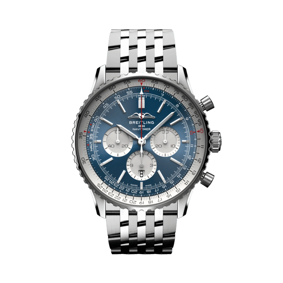 AB0137211C1A1 Breitling The Breitling Navitimer AB0137211C1A1 is a Men’s Watch with a 46 mm stainless steel case and a bidirectional stainless steel bezel with a slide rule. The crown is non screw-locked (with two gaskets), and the blue dial contains silver-colored sub-dials, silver-toned luminescent index and hour markers, and silver-colored luminous hour hands. This watch has three sub-dials for the chronograph function, with a 60-second sub-dial positioned at 9 o’clock, a 30-minute sub-dial placed at 3 o’clock, and 12-hour counters located at 6 o’clock. The date window is situated at the 6 o’clock position, and the self-winding mechanical movement is powered by a Calibre Breitling 01 (Manufacture) with 47 jewels and 28,800 v.p.h., offering a power reserve of around 70 hours. The case of the watch is a slim 13.9 mm thick and is protected by a sapphire crystal on both the front and back sides. The case back is transparent, allowing a view into the inner workings of the watch. The watch performs functions of hours, minutes, seconds, date, and chronograph. The Breitling logo is located below the 12 o’clock position, and the watch comes with a stainless steel bracelet with a stainless steel folding buckle. Additionally, this model is water-resistant up to 30m, making it a suitable choice for everyday wear.