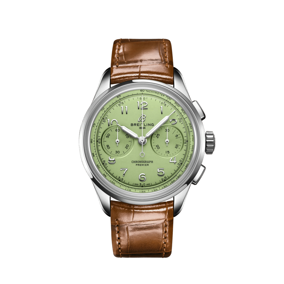 AB0930D31L1P1 Breitling The Breitling Premier B09 Chronograph AB0930D31L1P1 watch is a timeless stamp of impeccable taste, perfect for those who appreciate quality, accuracy, and style. With its 40mm stainless steel case, fixed stainless steel bezel, and non-screw-locked crown with two gaskets, this watch is functional and elegant. The green dial with silver Arabic numerals and hour markers, and silver hour hands with luminescent coating make it easy to read the time, while the two sub-dials chronograph with a 60 seconds sub-dial at 9 o’clock and a 30-minute sub-dial at 3 o’clock, and Tachometer scale on the outer edge of the dial enhance its overall design. The mechanical hand-wound movement, powered by a Calibre Breitling B09 (Manufacture) with 28 jewels oscillating at 28,800 v.p.h, guarantees accurate timekeeping. With a case thickness of 13mm, and a transparent case back, this watch is meant to last. The watch has a power reserve of approximately 70 hours and performs functions including hours, minutes, seconds, 1/4th second, and 30 minutes. The Breitling logo is located beneath the 12 o’clock position, adding to the allure of the watch. The brown alligator leather strap comes with a steel folding clasp, enhancing the overall look and durability of the watch. The watch is water-resistant up to 100 meters, making it suitable for swimming and snorkeling. This Breitling Premier B09 Chronograph AB0930D31L1P1 watch is a must-have for watch enthusiasts who appreciate quality, functionality, and style.