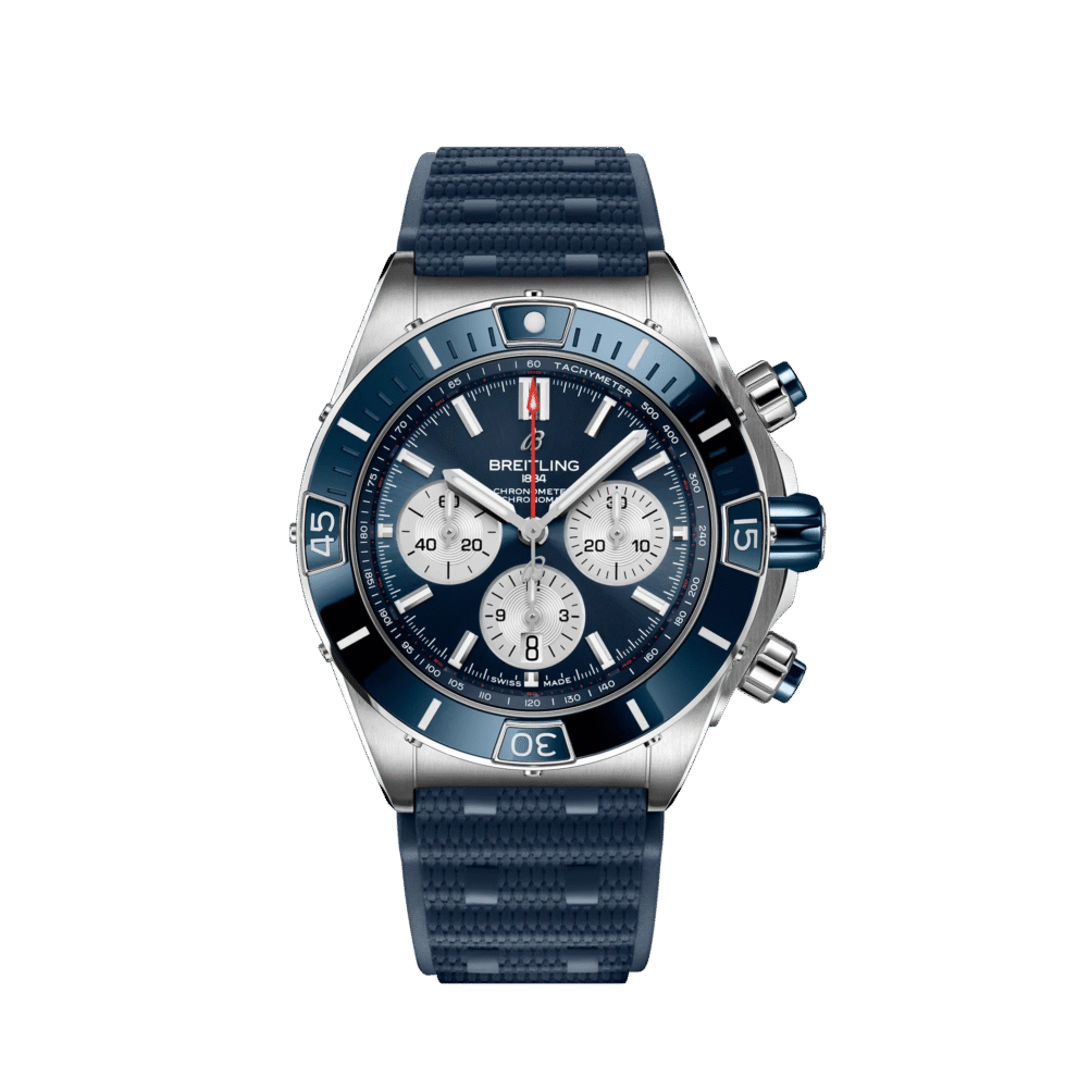 AB0136161C1S1 Breitling The Breitling Super Chronomat AB0136161C1S1 Men’s Watch features a sleek 44mm Stainless Steel case and a unidirectional ratcheted rotating Stainless Steel bezel, making it the perfect accessory for adventurers and watch enthusiasts alike. The watch has a beautiful blue dial with a “MĂ©ga Tapisserie” pattern, silver-toned luminescent counters, and index hour markers, which makes it easy to read even in low-light conditions. The watch also features three sub-dials, displaying 60 seconds-located at 9 o’clock, 30 minutes at 3 o’clock, and 12 hours and date at 6 o’clock- making it perfect for timing various events. The blue rubber strap with Stainless Steel folding buckle is comfortable to wear and provides a secure fit.