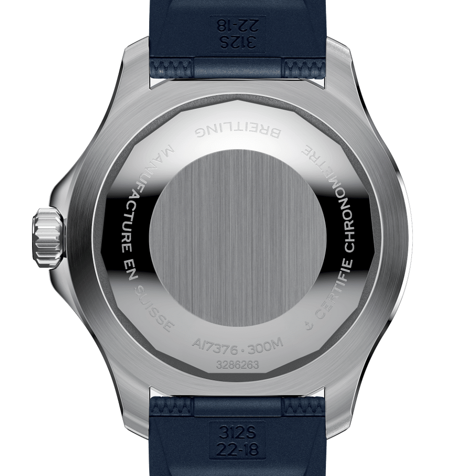 A17376211C1S1 Breitling The Breitling Superocean Automatic A17376211C1S1 is a diving watch with a 44 mm stainless steel case and a unidirectional rotating stainless steel bezel with a black enamel diving scale. It has a screw-locked crown, two gaskets and a solid case back. The blue dial features luminous silvery hands and index hour markers, with minute markers around the outer rim. The watch offers the following functions: hours, minutes, seconds, and a diving scale. The watch is powered by a self-winding mechanical movement, the Calibre Breitling 17, which has 26 jewels and a power reserve of approximately 38 hours. The case thickness is 12.62 mm, and the front side of the watch is protected by sapphire crystal. The blue rubber strap has a folding clasp, and the model is water-resistant up to 300 m, making it a suitable choice for diving enthusiasts.