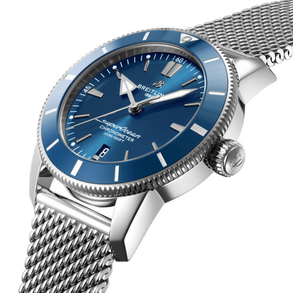 AB2020161C1A1 Breitling The Breitling Superocean Heritage II AB2020161C1A1 is a stunning watch designed for the modern watch enthusiast. With a 46mm stainless steel case, this watch makes a bold statement on the wrist, while the stainless steel mesh bracelet adds an extra touch of elegance. The uni-directional rotating coin edge stainless steel bezel features a blue ceramic top ring for count-up elapsed time and the blue dial is adorned with luminous silver-tone arrow-shaped hands and index hour markers. Minute markers around the outer rim provide added functionality. This analog watch is powered by the Breitling calibre 20 automatic movement, based on the Tudor MT5612, with 28 jewels and a bitting frequency of 28800 vph. It comes with a power reserve of approximately 70 hours, making it a reliable option for daily wear. The scratch-resistant sapphire crystal and solid case back protect the watch from scratches and wear, while the screw-locked crown ensures water resistance up to 200 meters or 660 feet. This watch also comes with a date display at the o’clock position, making it both practical and stylish. With a case size of 46mm, case thickness of 15mm, and a band width of 24mm, this watch is perfect for those who prefer larger watches that command attention. Overall, the Breitling Superocean Heritage II AB2020161C1A1 is a luxury watch that combines outstanding functionality with sophisticated design, making it a must-have for any watch enthusiast looking for a watch with impressive digital values.