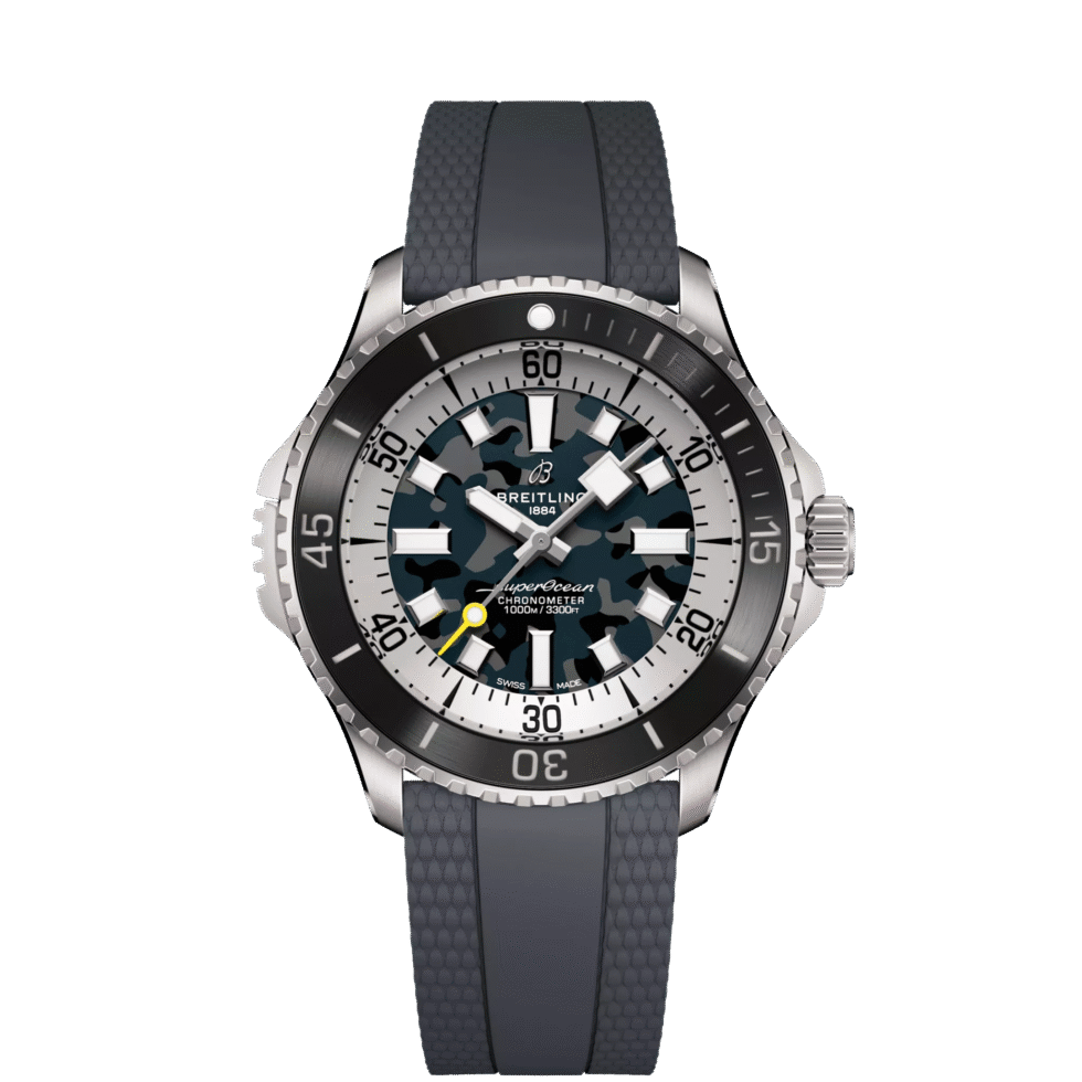 E10379351B1S1 Breitling This watch has a 46 mm Titanium case.  Rotating Titanium & antracite ceramic bezel with diver scale. Silvery inner bezel with minute scale. Grey camouflage dial. Luminous hour markers. Silvery hour hands with luminescent coating. Central second hand. The watch performs following functions: hours, minutes, seconds. Self-winding mechanical movement is powered by a ?alibre 10. Power reserve approximately 42 hours. Case back is solid. Sapphire crystal protects front side of the watch. Anthracite rubber strap with folding clasp buckle. This model is water-resistant up to 1000 m.