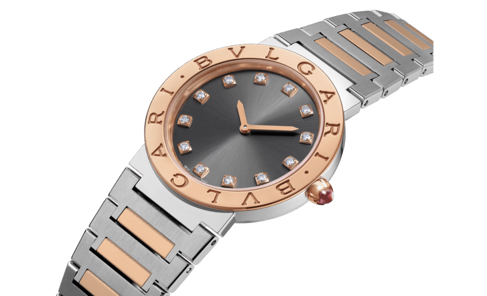 Bvlgari has been reinventing classic inspirations into pioneering designs for over 40 years. Bvlgari Bvlgari was the very first watch to use a logo as an element of design, an exquisite example of the brand’s creativity and craftsmanship. A frontrunner in today’s “logomania” movement; the distinctive double circular engraving was initially inspired by the curved inscriptions on ancient coins, growing from the Roman roots of the brand into an elegant fusion of culture and modernity, a true representation of everyday glamour. Bvlgari Bvlgari Lady watch with quartz movement, 33 mm stainless steel case, 18 kt rose gold bezel with logo, 18 kt rose gold crown set with a pink cabochon-cut stone, gray lacquered dial, diamond indexes, and stainless steel and 18 kt rose gold bracelet.