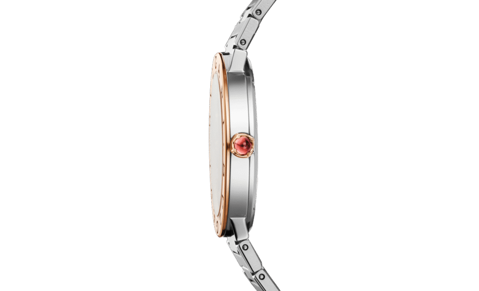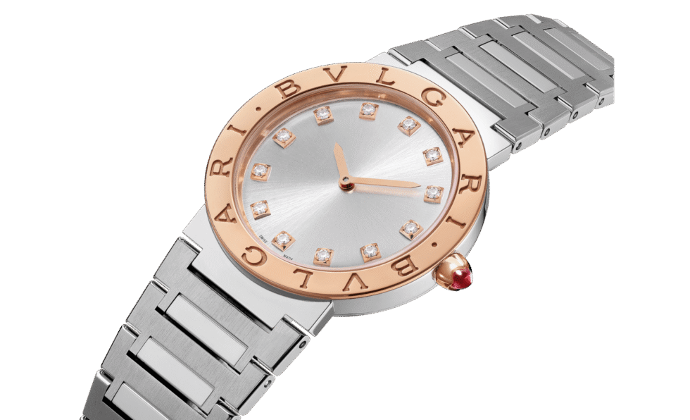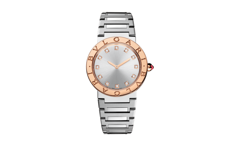 First launched in 1977, the timeless Bvlgari Bvlgari Lady watch in stainless steel and 18 kt rose gold embodies more than 40 years of bold creativity and distinctive style. Inspired by the curved inscriptions on ancient Roman coins, the iconic double logo engraved on the bezel and framing the silvered sunray dial expresses Bvlgari’s unparalleled ability to fuse culture and modernity into creations that go beyond time and trends. A precious touch is given by the brilliant-cut diamond indexes.