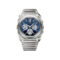dial with translucent lacquer and “azurĂ©” silver counters, rhodium plated hands, and applied indexes with superluminova SLN, Satin-polished steel bracelet with 3 blades folding buckle. Mechanical in house ultra-thin movement BVL 318 Finissimo caliber with automatic winding (peripheral rotor), chronograph, small seconds and second time zone functions. Thickness 3.30 mm, Frequency 28’800 VpH (4Hz) Jewels 37. Diameter 37,20. Water-resistant up to 100 metres, 55 hours of power reserve.