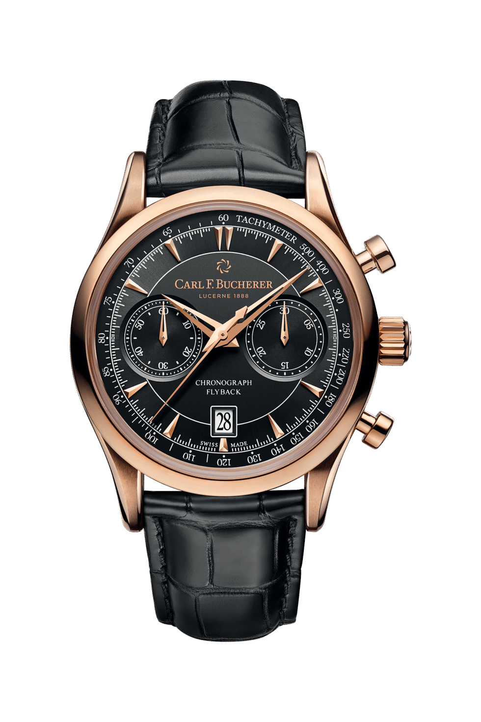 Carl F. Bucherer 00.10919.03.33.01 The Carl F. Bucherer Manero Flyback 00.10919.03.33.01 is a stunning men’s watch that exudes luxury and style. With a 43mm 18kt rose gold case and a black alligator leather strap, it combines elegance and sophistication, making it a perfect accessory for formal occasions. The double-domed sapphire crystal with anti-reflective coating on both sides protects the black dial, which features rose gold-tone hands and index hour markers, along with minute markers and tachymeter markings around the outer rim. This combination of colors and design elements adds a touch of refinement and sportiness to the watch. The 18kt rose gold fixed bezel and 18K rose gold pin buckle further enhance the watch’s luxurious appearance, creating a harmonious and eye-catching timepiece. Powering the watch is the Carl F. Bucherer Caliber CFB 1970 automatic movement, based upon the ETA 7750, containing 25 Jewels and operating at 28,800 vph, providing precise timekeeping and a power reserve of approximately 42 hours. The watch offers multiple functions, including a flyback chronograph, a date display at the 6 o’clock position, and two sub-dials displaying 60 seconds and 30 minutes, allowing for accurate timing and measurement. The scratch-resistant sapphire crystal and transparent case back provide a view of the intricate movement within, showcasing the craftsmanship and attention to detail put into the watch’s design. With a water resistance of 30 meters (100 feet), the Carl F. Bucherer Manero Flyback ensures durability for everyday wear, although it is not recommended for swimming or diving. The Manero Flyback Series embodies a combination of refined elegance and precision engineering, making it a luxury watch style that complements a gentleman’s sophisticated taste. Whether worn with formal attire or adding a touch of luxury to casual ensembles, this timepiece is a testament to Carl F. Bucherer’s commitment to craftsmanship and design excellence.