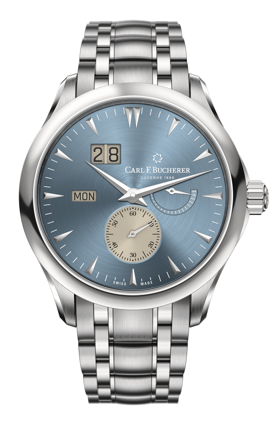 Carl F. Bucherer 00.10926.08.53.21 The Carl F. Bucherer Manero Peripheral Bigdate 00.10926.08.53.21 is a refined and sophisticated men’s watch that combines classic design with modern functionality. With a 42mm stainless steel case and a matching stainless steel bracelet, it exudes a timeless and versatile look, making it suitable for both formal occasions and everyday wear. The domed sapphire crystal with anti-reflective coating on both sides ensures clear visibility and protects the dial, while the case back with sapphire crystal allows you to glimpse the intricate movement within, showcasing the watch’s craftsmanship. The stainless steel folding clasp provides a secure and comfortable fit, ensuring the watch stays firmly on the wrist. The light blue dial features a small-seconds indication in beige, creating an eye-catching contrast that adds an element of elegance to the watch’s design. Powering the watch is the Carl F. Bucherer Caliber CFB A2011 automatic movement, which boasts 33 jewels and a power reserve of approximately 55 hours, ensuring accurate timekeeping and reliable performance. The watch performs a range of functions, including a chronograph for precise timing, a date display, and the traditional hours, minutes, and seconds indication. With a water resistance of 30 meters (3 atm), the Carl F. Bucherer Manero Peripheral Bigdate is suitable for everyday wear and can withstand splashes and brief immersion in water. This timepiece is a perfect fusion of style and functionality, making it a cherished accessory for men who appreciate a watch that offers both classic aesthetics and modern features. Whether worn for business meetings or casual outings, the Carl F. Bucherer Manero Peripheral Bigdate is a sophisticated companion that elevates any outfit and reflects the wearer’s refined taste.