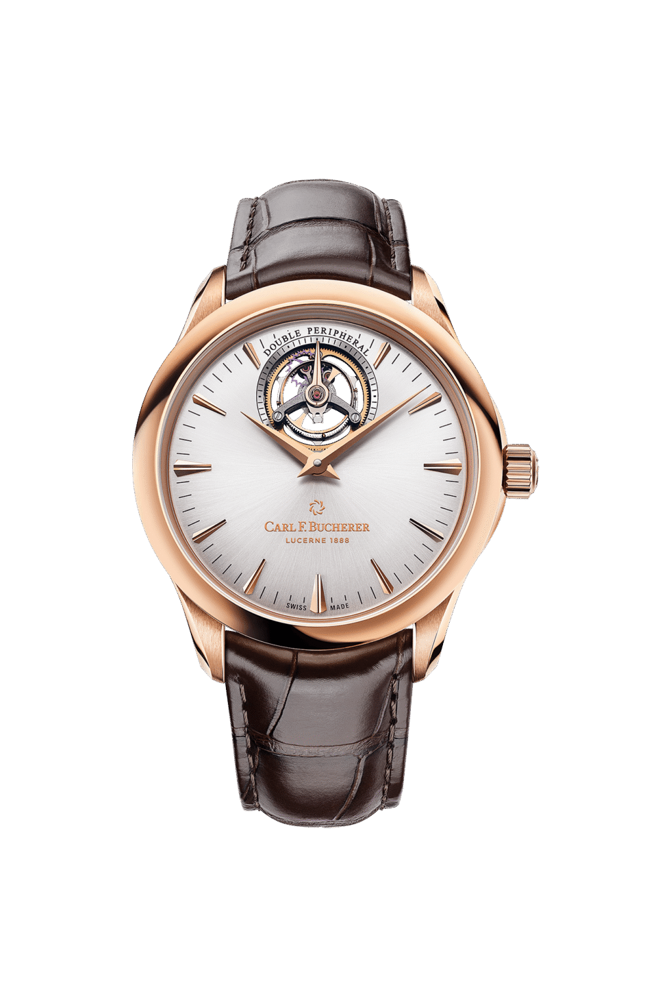 Carl F. Bucherer 00.10920.03.13.01 The Carl F. Bucherer Manero Tourbillon Doubleperipheral 00.10920.03.13.01 is a masterpiece of horological artistry, designed for discerning gentlemen who appreciate both luxury and precision. Encased in a 43mm 18K Rose gold case, this timepiece exudes opulence and refinement. The hand-stitched dark brown Louisiana alligator leather strap complements the elegance of the watch, providing a luxurious touch. With a case thickness of 11.57 mm, it strikes the perfect balance between presence and wearability. The convex sapphire crystal, featuring an anti-reflective coating on both sides, ensures clarity and readability while protecting the dial. The 18k rose gold bezel adds a touch of sophistication to the watch’s design. The silver dial is a work of art, enhanced by rose gold-tone hands and index hour markers, reflecting the brand’s dedication to exquisite craftsmanship. Powered by the Caliber T3000 automatic movement, this timepiece boasts an impressive power reserve of 65 hours, ensuring reliable performance even after days of wear. The sapphire crystal case back reveals the intricate movement, allowing you to admire the intricacies of the watch’s inner workings. In terms of functionality, the Manero Tourbillon Doubleperipheral is a horological marvel. It offers a chronometer, hour, minute, small seconds, and seconds stop function, showcasing the watch’s precision and versatility. Additionally, it features peripheral Technology, a cutting-edge innovation that further enhances the accuracy and performance of the timepiece. The tourbillon complication, a showcase of horological expertise, adds a touch of technical brilliance.