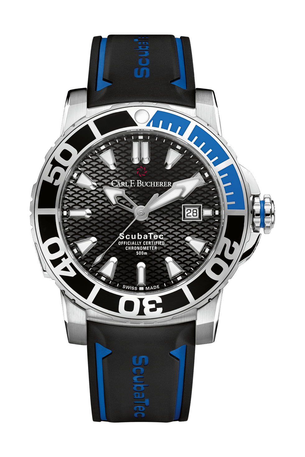 Carl F. Bucherer 00.10632.23.33.01 The Carl F. Bucherer Patravi Scubatec 00.10632.23.33.01 is a watch for men that flawlessly combines strength and style. Born from the fusion of aesthetics and functionality, this timepiece bears the signature of Carl F. Bucherer’s craftsmanship. Nestled within a robust 45 mm stainless steel case, this watch exudes sophistication. The sapphire crystal case, adorned with anti-reflective coating on both sides, offers a clear view while ensuring resilience against daily wear. The uni-directional rotating stainless steel bezel proudly presents a black and blue ceramic ring, reminiscent of the iconic “Batman” design. Against the backdrop of a black dial, silver-tone hands and index hour markers elegantly mark time, while minute markers encircle the outer rim. Tastefully practical, the discreet date display resides at 3 o’clock, offering a reminder of both the present moment and the intricate mechanics that drive this timekeeping wonder. Housing the Carl F. Bucherer calibre CFB 1950.1 automatic movement, embellished with 26 jewels, this timepiece orchestrates its dance at 28,800 vibrations per hour, backed by a 38-hour power reserve. Designed for aquatic adventures, the watch maintains its composure at depths of 500 meters (1650 feet) underwater. The scratch-resistant sapphire crystal protects the dial, resistant against the passage of time. The screw-down crown enhances water resistance. Balancing comfort and security, the black and blue rubber strap envelops the wrist with ease. With a round case shape measuring 44.6 mm in diameter and a robust 13.45 mm thickness, the watch boasts a commanding presence. Beyond basic timekeeping, the watch’s functionality shines with a suite of features. Holding the “chronometer” distinction, it underscores precision and performance. Emerging as an emblem of luxury and innovation, the Patravi Scubatec series marries aesthetics and utility. Every aspect, from the movement to the design, reflects the brand’s dedication to excellence.
