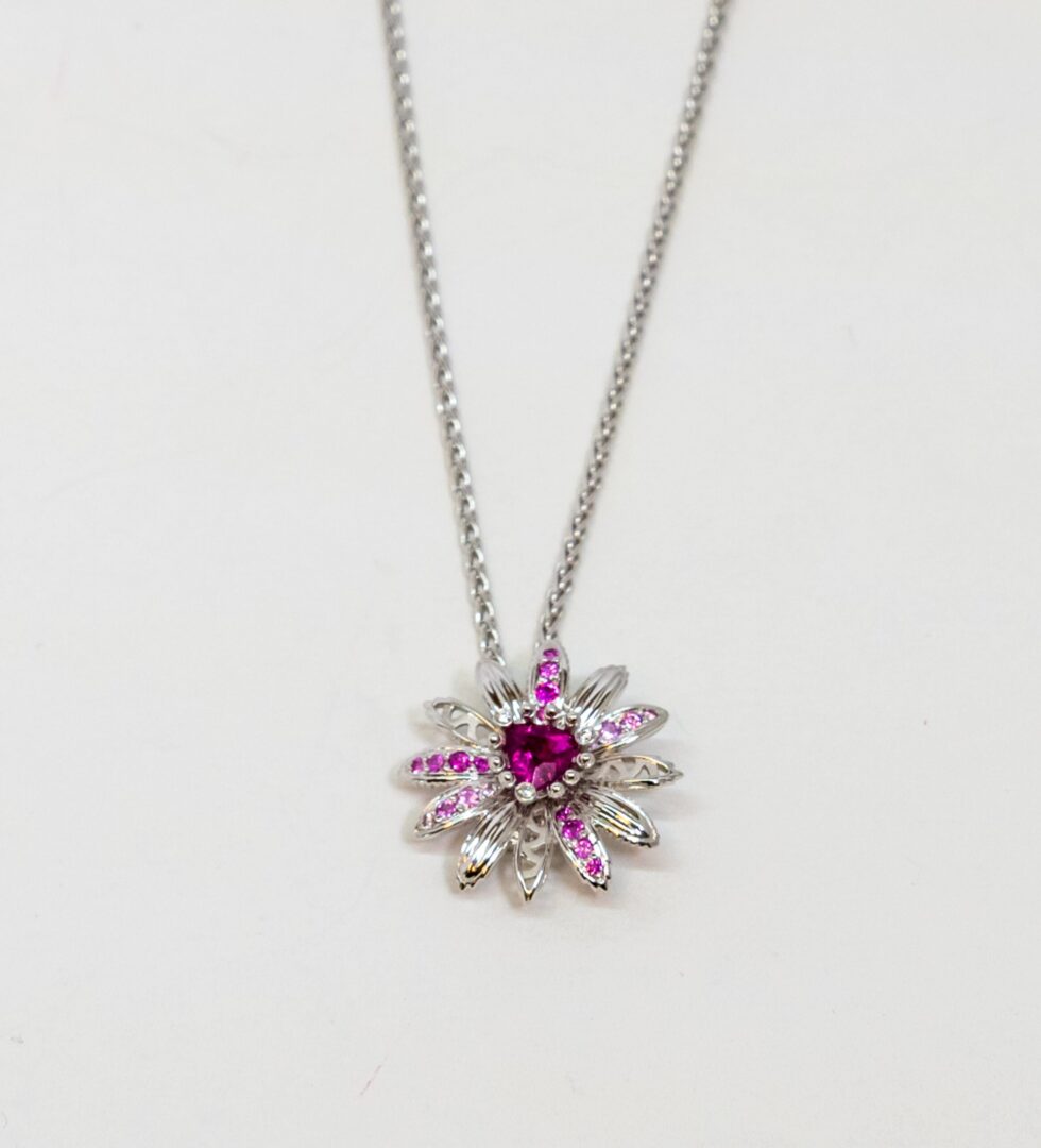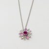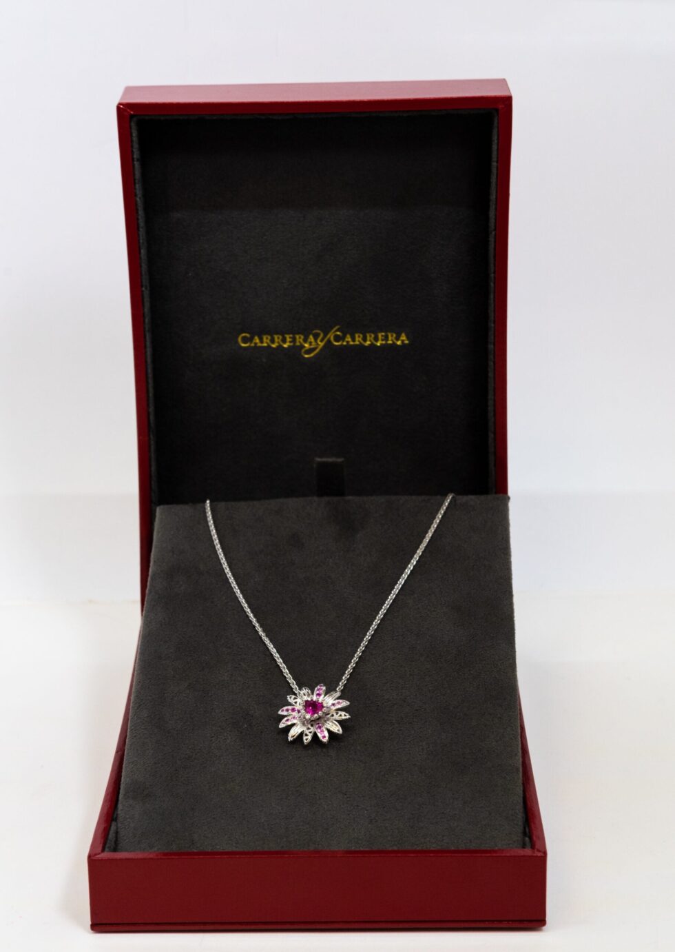 10070330 Carrera Y Carrera 18K White Gold pendant. 18K White Gold cable chain with lobster claw lock. This piece has a flower-shaped pendant which decorated with a pink Sapphire main stone, 3 Diamonds, and 20 small light pink and pink Sapphires on petals.