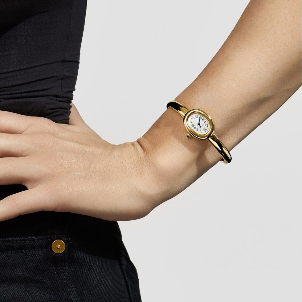 The Cartier Baignoire is crafted in a yellow gold case and matching bracelet. The silvered dial hosts the blue sword hands and Roman numeral hour markers, classic features for the brand. Cartier Baignoire WGBA0018 is considered to be the “mini model” for its everlasting, subtly-chic fit, at a case size of 24.6 mm x 18.7 mm.Â