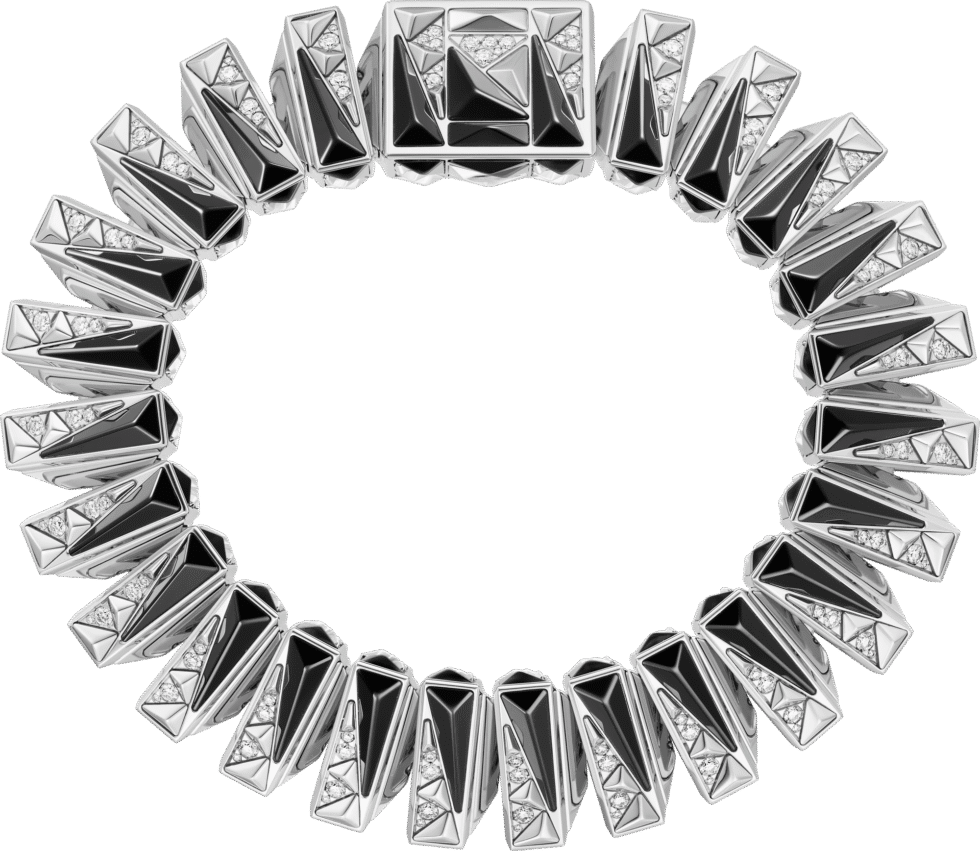 HPI01531 Cartier Libre The Cartier Libre HPI01531 watch is a stunning timepiece that features a 99.95 x 84.75 mm rhodiumized white gold case. The case is decorated with 465 brilliant-cut diamonds totaling 7.9 carats and 54 black pyramid-cut spinels. The reversible strap is also set with diamonds and features a combination of black and white tones. The watch has a silver dial with gray steel sword-shaped hands, which complements the overall elegant design of the timepiece. The watch is powered by a quartz movement and has a solid case back. The front side of the watch is protected by sapphire crystal. The watch also features a rhodiumized white gold bracelet, which adds to its luxurious appearance. The Cartier Libre HPI01531 watch displays hours and minutes and has a case thickness of 20.32 mm. It is water-resistant up to 30 meters, making it suitable for everyday wear. This watch is a testament to Cartier’s expertise in crafting exquisite timepieces that combine art and technology to create a luxurious and sophisticated look.