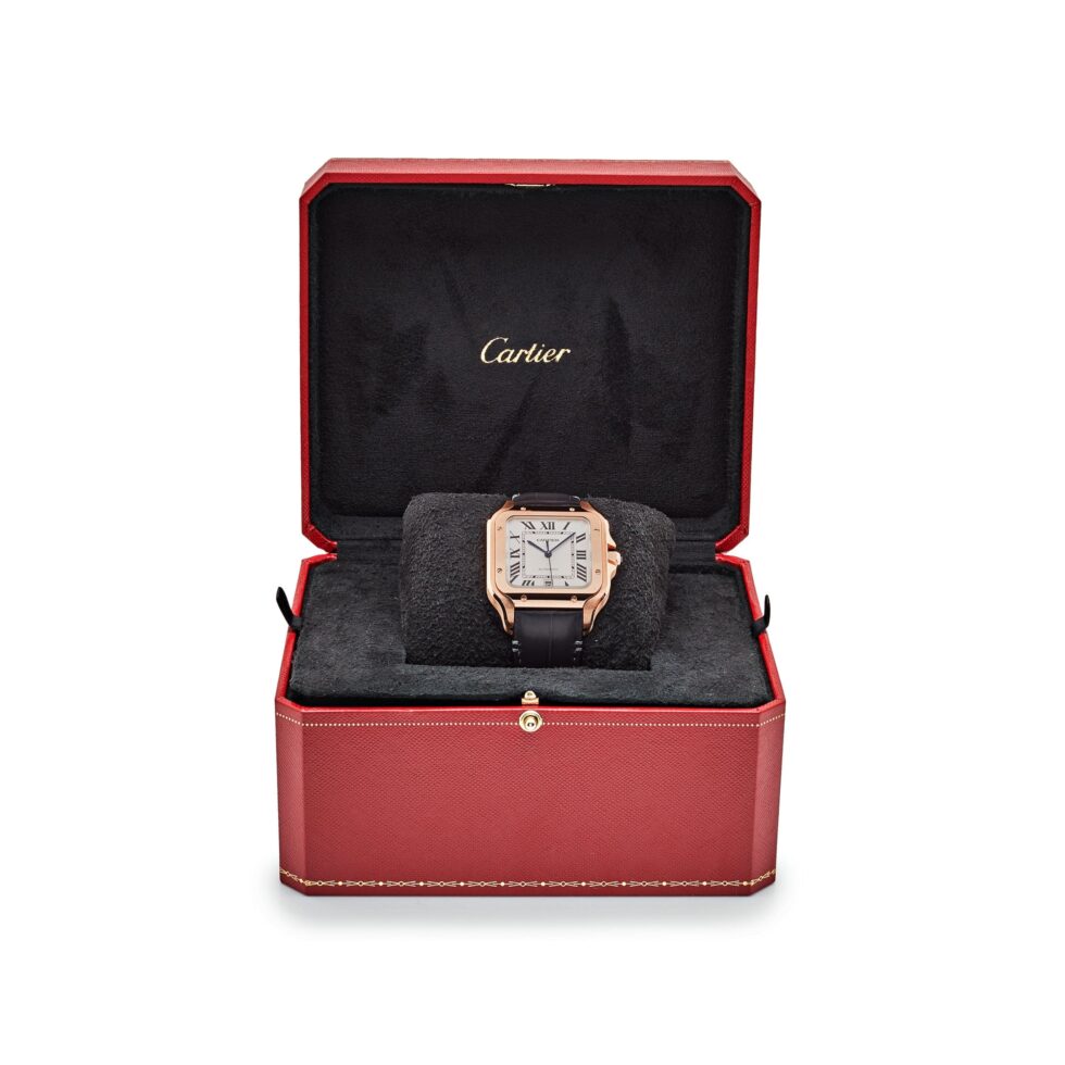 Santos de Cartier, large model with automatic mechanical movement, caliber 1847 MC. The case and 7-sided crown are crafted from rose gold, with the crown set with a faceted sapphire. The watch features a silvered opaline dial, blued-steel sword-shaped hands, and a sapphire crystal. It comes with a rose gold bracelet equipped with the “SmartLink” adjustment system, and an additional alligator skin bracelet with an interchangeable rose gold folding buckle.Â