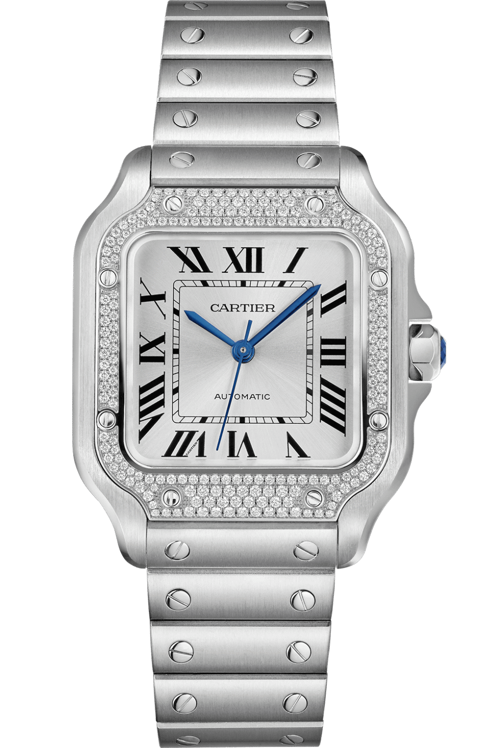 W4SA0005 Cartier The Cartier Santos W4SA0005 watch is a luxury timepiece designed for both men and women. It features a 35.1mm stainless steel case and a fixed stainless steel and diamond bezel. The heptagonal crown is set with a faceted synthetic spinel, adding to its overall elegant design. The bezel is set with 206 brilliant-cut diamonds, totaling 0.64 carats, which further enhances its luxurious appeal. The watch has a silver dial with sunray-effect and black Roman numerals, giving it a classic and timeless look. The blued-steel sword-shaped hands complement the design and add a touch of sophistication. Minute marks in the form of railway tracks add to the watch’s functionality and make it easy to read. The Cartier Santos W4SA0005 is powered by a self-winding mechanical movement, the Calibre 1847 MC, with a power reserve of approximately 42 hours. The case back is solid, and the sapphire crystal protects the front side of the watch. Case thickness – 8,83 mm. The watch performs the functions of hours, minutes, and seconds. The steel bracelet of the watch comes with a “SmartLink” adjustment system, making it easy to adjust the size of the bracelet. The watch also comes with a second bracelet made of calfskin, with a steel interchangeable deployant buckle. Both bracelets are equipped with the “QuickSwitch” interchangeability system, which makes it easy to switch between them. This model is water-resistant up to 100 meters, making it suitable for swimming and snorkeling but not for diving. Overall, the Cartier Santos W4SA0005 is a luxurious and sophisticated watch that is both functional and stylish.