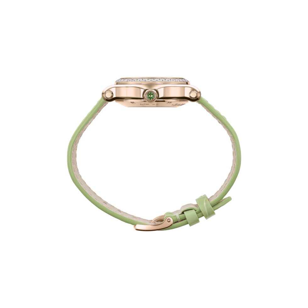 274893-5016 Chopard This Watch comes with 30 mm 18K rose gold case. Fixed 18K rose gold bezel set with diamonds. Green textured mother-of-pearl dial. The dial with five dancing diamonds. Total weight of diamonds ~1.26 cts. Rose gold Roman nymerals and hour markers. Roman numerals appear at the 3, 6, 9 and 12 o’clock positions. Rose gold leaf-shaped hour hands. Central second hand. The watch performs following functions: hours, minutes, seconds. Self-winding mechanical movement is powered by a ?alibre 09.01-C. Case Thickness – 11.23 mm. Case back is trasparent. Sapphire crystal protects front and back side of the watch. Green alligator leather strap with tang buckle. This model is water-resistant up to 30 m.