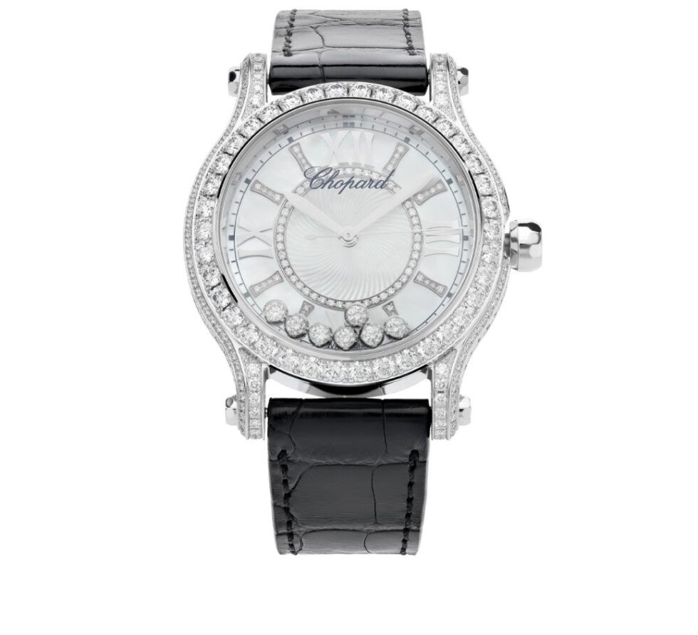 274891-1008 Chopard The Chopard Happy Sport Ethical 274891-1008 is a stunning wristwatch from the brand. This model features a 36mm ethical 18K White gold case with a fixed ethical 18 K White gold & Diamonds bezel. The mother of pearl dial features a spiral guillochĂ© pattern in the center and has seven floating diamonds. The leaf-shaped hands are silver-tone, and the applied index hour markers are encrusted with diamonds, and the applied Roman numerals appear at the 3, 6, 9, and 12 o’clock positions. The total weight of the gems in the watch is 4.64 carats. The self-winding mechanical movement of this watch has 25 Jewels and powers essential functions like hours, minutes, and seconds, with a power reserve of approximately 42 hours. The watch features a scratch-resistant sapphire crystal and has a round case shape. The case back is transparent, and the watch is water-resistant up to 30 meters. The black alligator leather strap comes with an 18K White gold and Diamonds tang buckle, making this watch an elegant and luxurious addition to the collection. Overall, the Chopard Happy Sport Ethical 274891-1008 is a stunning watch that stands out for its exquisite design, impressive craftsmanship, and reliable performance.