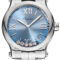 278582-3008 Chopard. The Chopard Happy Sport 278582-3008 watch is features a stainless steel case and bracelet, with a light blue sunray dial and Roman numeral and index hour markers. The watch also features a fine black printed minute track, as well as five floating diamonds with a combined weight of 0.24 carats. The date is displayed between the 4 and 5 o’clock positions, and the crown is set with a blue sapphire. The watch has a round case shape with a diameter of 36mm and a fixed bezel. It is water-resistant up to 30m/100ft and has a solid case back. The band material is stainless steel with a hidden folding clasp, and the movement is quartz. Overall, the Chopard Happy Sport watch is a stylish and elegant timepiece with a classic design. The floating diamonds add a touch of luxury and sophistication, while the stainless steel construction and scratch-resistant sapphire crystal provide durability and longevity. The quartz movement ensures precise timekeeping and low maintenance, making this watch an excellent choice for everyday wear.