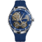 The Accutron DNA Casino collection makes a futuristic and bold statement with four new color ways: green, blue, orange, and red, that echo the neon city skyline and the bright atmosphere of Las Vegas and its iconic casinos. The Accutron DNA Casino watches honor the past with the signature open-face design, but also look ahead to the future, using a proprietary electrostatic energy movement with an intricately engineered motor and turbine system that generates power and the smooth forward glide of the second hand. This timepiece features a 45.1mm stainless steel case in grey finish with silver-grey accent on the outer hour/minute ring, blue colored open-work dial and silver-tone hands. With stamped Accutron logo and turbine design on the blue case back, this watch is finished with an integrated high-tech blue rubber strap with double-press deployant closure and an orange crown matching the open work dial. Historically the brand has used numbers to reference their watches and for this new collection, Accutron has included time stamps on the case back to differentiate each of the colors. Limited Edition of 100 pieces each.