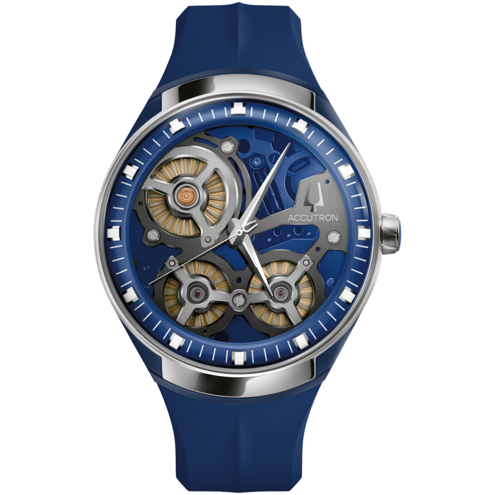 Signature Accutron green accents on the outer minute ring. Blue color open-work dial and polished silver-tone hands.
