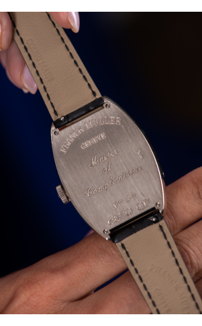 Preowned-6850 QP Franck Muller  This watch has a 34 ? 47 mm 18K White Gold case. Fixed 18K White Gold bezel. Silvery guilloché dial. Blue hour hands.Central second hand. Black Arabic numerals. This watch has four chronograph sub-dials at 3 ,6 ,9 and 12 o’clock. The watch performs following functions: hours, minutes, seconds, moon phase, month, day of the week. Self-winding mechanical movement is powered by a ?alibre 1188MC with 37 jewels. Power reserve approximately 47 hours. Case back is solid. Sapphire crystal protects front side of the watch. Water resistant up to 30 m./ 100ft.